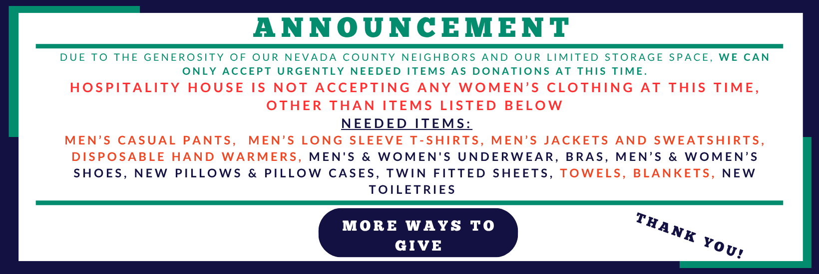 The mission of Hospitality House is to provide pathways to permanent housing by compassionately bringing homeless people in Nevada County into a circle of community caring that offers shelter, housing resources, sustenance, opportunity, dignity, and hope as we assist them in transitioning from homelessness to housing.
