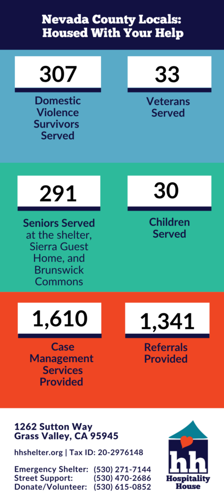The mission of Hospitality House is to bring homeless Nevada County residents into a circle of community caring that offers shelter, sustenance, medical care, advocacy, opportunity, dignity, and hope as we assist them in transitioning from homelessness to housing. Hospitality House is a 501(c) 3 nonprofit corporation serving Nevada County since 2005.