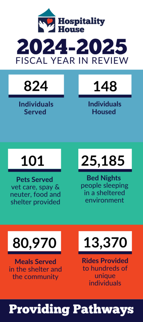 - Outreach case managers made 2707 contacts with 176 homeless individuals not staying at Hospitality House.